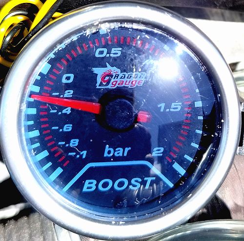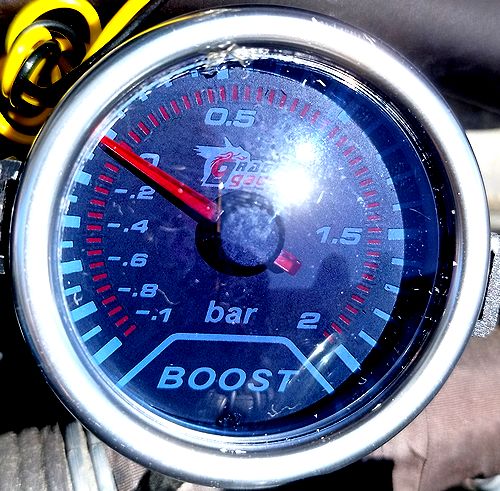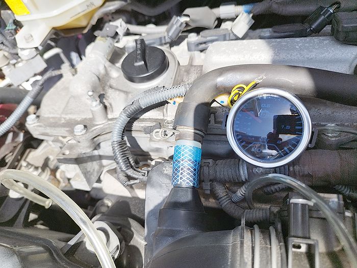 さて走行中ケース内圧を観察したくなるのが人の情である。これは簡単で、ブースト計の配管をオイルレベルゲージに固定すればいいのである。あとは室内までチューブを窓をあけて引き込みインパネにガムテープで固定すればいいのである。ブースト計はエアコン用ゲージと表示が同じことを確認してある。