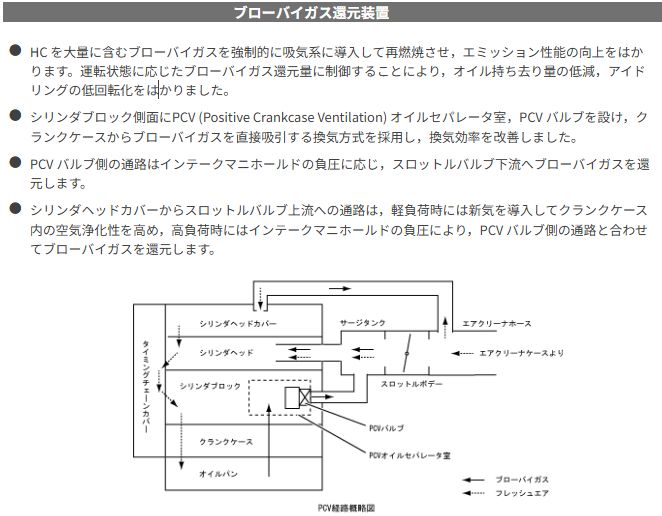 ブローバイは2系統ある。ヘッドカバーからエアクリケースへのエルボーにつながっている極太の「エアクリーナーホース」とシリンダからPCVを経てインテークにつながっている系の2つである。 PCVはエンジン前面のインテーク裏のアルミ製オイルセパレーターに横向きに刺さっていてクーラントホースの間のややこしい所からスロットルバルブ直下に入っている。ここは負圧が発生するところで、極太のエアクリーナーホースと相まって換気をかなり強力に行う設計である。これはスロットルバルブのクーラント配管の奥でEGR関係の配管もあり見えにくい。サービスマニュアルはボールジョイントロックナットレンチ(22mm)で脱着しろというが、これは嘘でそれではバルブを回して脱着することはできない。多くの整備士はクーラントとEGRの配管とインテークを外すと思うが、実はエンジンの下からは直視できて脱着も非確定容易であるが、まあPCVはめったに壊れないという前提なのだろう。