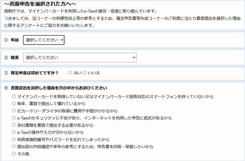 簡単にまとめると、昨年までのように、「マイナ連携による電子申告はスマホでできて簡単です」、という推しの表現がなくなり、「マイナ連携による電子申告は準備が必要です」、と実情に沿って注意を喚起する内容に改められたこと、またマイナカード読み込みが可能であって電子申告を選んでも、最終的に物理的な書類提出ができるチョイスが提供されたことが、大きな改良であろう。これについては、どちらも昨年の、