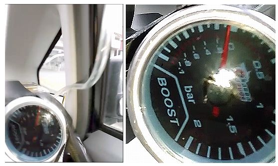 負圧配管はボンネットの隙間から窓を開けてインパネにガムテープで固定した負圧計につながっている。前回同様ゼロ点が-0.05atmくらいズレている。