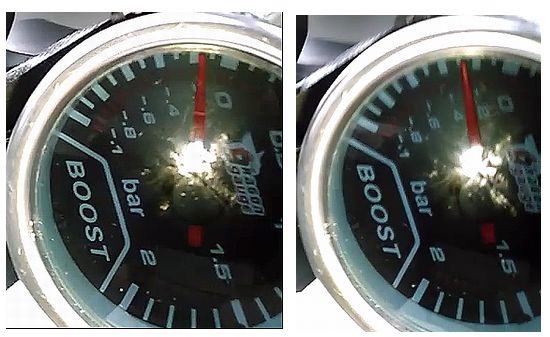 次に通常走行時でのエンジンブレーキ時だが、なかなか-0.2atmには達しない。最後が背振峠からの長い下りで回生で電池が満充電になり回生失効となり、Bレンジで強制エンジンブレーキがかかった状態である。針は-0.25atm附近を指している。実際には最大で瞬間的に-0.3atmあたりまで振ったのだがちょうど道の段差で画像が乱れたので画像にできなかった。