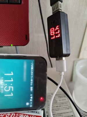 手元にある殆どすべての電源アダプターとパソコン類のUSB電圧を調べたところ、5.1Vから5.2Vくらいが多いが、貴重な最低のものは4.8Vだった。10台以上の機器でUSB充電可能な最低電圧を調べた所、4.6V程度であることがわかった。また充電が50-80%にしか達しない電圧を調べたところ4.6Vから4.7Vだった。この電圧を供給できれば機器を常時即用状態に保てる。貴重な4.8V1.5Aの充電器からUSBハブを介して現用のスマホ2台を常時電源ONで充電している。